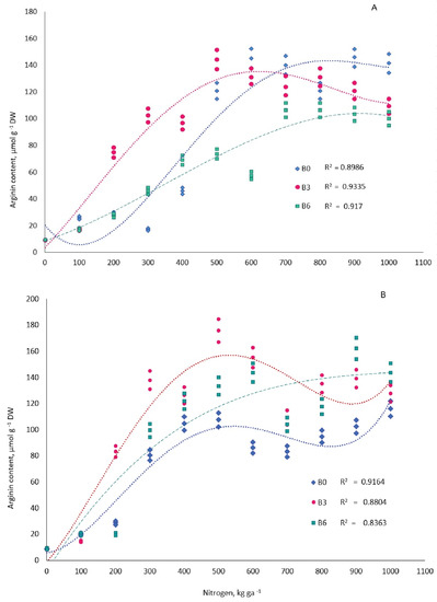 Dependence of the accumulation of arginine in the one-year-old needles of 16-year old Pinus sylvestris L. on the nitrogen fertilizers on three backgrounds of boron supply. B0, B3, B6—boron doses of 0, 3.0, 6.0 kg ha−1, respectively. (A) September 2014; (B) March 2015 (for regressive equation, see Table 4).