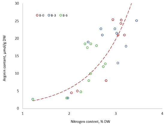 Dependence of the accumulation of arginine in the needles of Pinus sylvestris L. on the nitrogen content on three backgrounds of boron supply. B0, B3, B6—boron doses of 0, 3.0, 6.0 kg ha−1, respectively. September 2014.