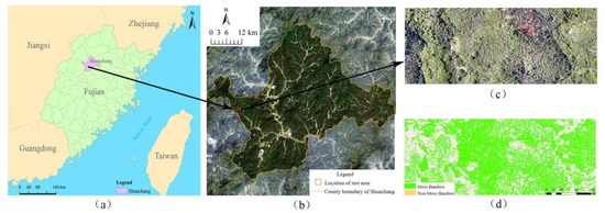 Overview of the test area and data processing: (a) geographic location of Shunchang County; (b) aerial image of Shunchang County; (c) unmanned aerial vehicle (UAV) orthophoto image of the test area; (d) image obtained after extracting the thematic information of Moso bamboo forest from UAV images.