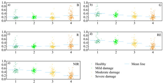 Changes in the internal structure and external morphological characteristics of Moso bamboo caused by PPC will present as changes in the spectral reflectance of the affected Moso bamboo at both the visible and near-infrared wavelengths. Hence, the reflectance of extracted individual image bands was normalised, and the spectral variation of the Moso bamboo canopy under different damage levels was analysed based on the normalised individual image bands, as shown in Figure 2, where the horizontal coordinates 1, 2, 3, and 4 represent healthy, mild damage, moderate damage, and severe damage, respectively. No obvious change was observed in B-band reflectance under different severities, and the R-band reflectance was higher for moderate and severe damage than for healthy and mild damage. Moreover, the reflectance of R-band under severe damage was particularly visible, likely due to the image resolution being higher and the canopy of severely damaged, or even dead, Moso bamboo was sparser; therefore, the reflectance was influenced by the background such as branches and soil, thus not showing a proper monotonic trend. Unlike the B and R bands, the reflectance of the G, RE, and NIR bands tended to decrease as the damage level increased. As the host nutrient deficiency caused by PPC tends to obliviate the “green peak” and “red valley” of the spectrum, the reflectance of G, RE and NIR bands tends to decrease with an increasing damage level.