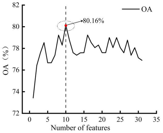RF-RFE feature selection. The red dot inside the circle represents the overall accuracy (OA) corresponding to the optimal number of feature dimensions, i.e., 80.16%.