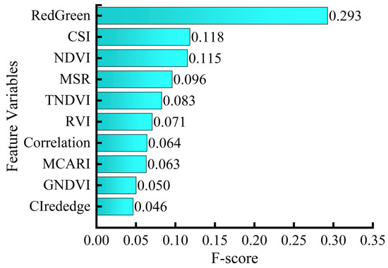 To determine the optimal subset of features for the model, RF-RFE was used to screen 31 features (Figure 3). From the figure, it can be seen that classification accuracy reaches a maximum at ten features and tends to decline as more features are added. Therefore, the first ten features were selected as the optimal subset. The importance of the features in the optimal feature subset in descending order of importance are RedGreen, CSI, NDVI, MSR, TNDVI, RVI, correlation, MCARI, GNDVI, and CIrededge (Figure 4).
