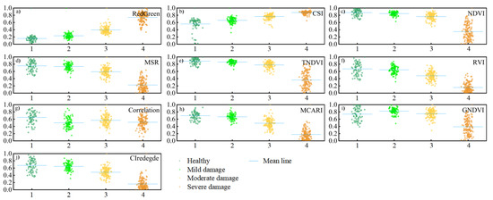 Variation characteristics of the selected features according to damage severity. (a) RedGreen, (b) CSI, (c) NDVI, (d) MSR, (e) TNDVI, (f) RVI, (g) Correlation, (h) MCARI, (i) GNDVI, (J) Clredegde.