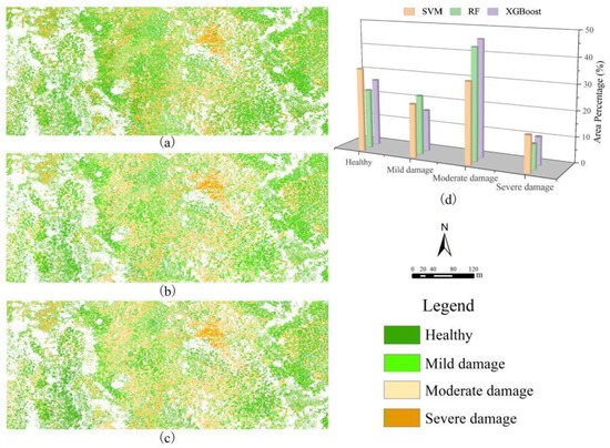 The accuracy of the three models in detecting the degree of damage (healthy, mild, moderate, and severe damage) was then analysed. The prediction accuracy of SVM and XGBoost for mild damage was lower than that for the other degrees, at 75.00% and 79.17%, while the Kappa coefficients were 0.565 and 0.746, respectively. As for RF, the prediction accuracy and Kappa coefficient were lower for healthy plants compared to the other levels, at 76.19% and 0.722, respectively. The detection performance of the three models was better for moderate and severe damage, with an accuracy between 80–93.75% and a Kappa coefficient between 0.7–0.922. Overall, XGBoost had the best detection performance for the four degrees of damage, with the lowest detection accuracy being close to 80% and the lowest Kappa coefficient being 0.746.