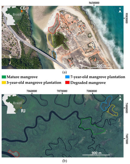 Two mangrove forests under revegetation programs were sampled along the Brazilian coast: a mangrove forest at the Guanabara Bay (Rio de Janeiro state, SE-Brazil) and another mangrove forest at the Cocó river (Ceará state, NE-Brazil; Figure 1). Plots at different stages of revegetation (i.e., 3- and 7-year-old plantations) were found at both sites, thus allowing for a temporal analysis of the effects of revegetation and their comparison with degraded plots and adjacent mature mangrove forests. The Cocó river estuary in Ceará has constituted a conservation unit of the Environmental Protection Area of Sabiaguaba since 2006. During this period, mangrove replanting initiatives have been carried out [30]. The Guanabara Bay in Rio de Janeiro is located within a Permanent Preservation Area (PPA) that covers more than 1300 ha [31]. The PPA was created in 1984 to preserve mangrove forests and support reforestation programs [31,32].