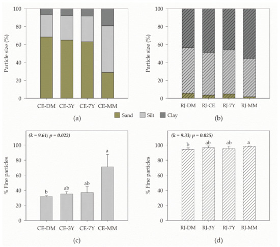 Soils from the CE site were dominated by sand and were predominantly classified as having a sandy–loam texture (CE-7Y, sand: 63%, silt: 29%, and clay 8%; CE-3Y, sand: 65%, silt: 27%, and clay 8%; CE-DM, sand: 68%, silt: 25%, and clay 7%), except for CE-MM (sand: 29%, silt: 52%, and clay 19%; Figure 2a), which showed a loam texture. On the other hand, soils from the RJ site showed a higher presence of fine particles with a silty–clay texture in RJ-MM (sand: 2%, silt: 43%, and clay 56%), RJ-7Y (sand: 5%, silt: 49%, and clay 46%), and RJ-DM (sand: 6%, silt: 51%, and clay 44%), and a silty–clay–loam texture in RJ-3Y (sand: 4%, silt: 48%, and clay 49%; Figure 2b).