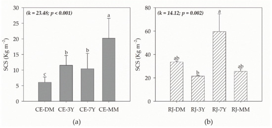 In the Ceará site, mean SCS values were significantly higher (k = 23.48; p < 0.001) in mature (CE-MM: 20.2 ± 6.4 Kg m−2) than in replanted mangroves (CE-7Y: 11.5 ± 3.1 Kg m−2; CE-3Y: 10.5 ± 4.9 Kg m−2) and in degraded plots (CE-DM: 6.1 ± 1.7 Kg m−2; Figure 3a). No significant differences were observed between the replanted plots (CE-3Y and CE-7Y), while significantly lower SCS values were observed in CE-DM (Figure 3a).