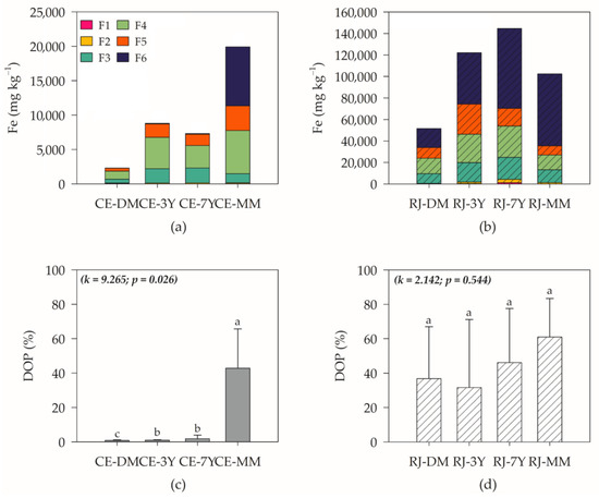 Fe partitioning (a,b) and degree of Fe pyritization, DOP (c,d) in all studied plots. Different lowercase letters indicate significant differences among variables found by the Kruskal–Wallis test at the 5% probability level, and k values above the critical k (7.8147) indicate statistical differences.