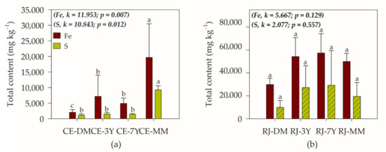 Total Fe and S contents in all studied plots in Ceará (a) and Rio de Janeiro (b). Different lowercase letters indicate significant differences among variables found by the Kruskal–Wallis test at the 5% probability level, and k values above the critical k (7.8147) indicate statistical differences.