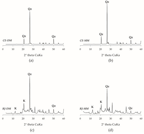 XRD data of nonoriented soil samples from both degraded and mature mangroves in the Ceará (a,b) and Rio de Janeiro (c,d) sites. Qz: quartz, K: kaolinite.