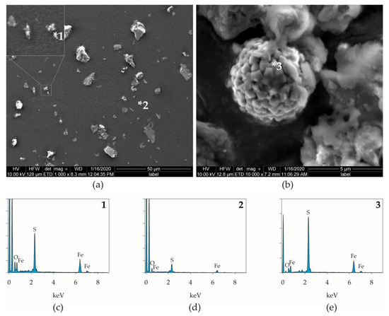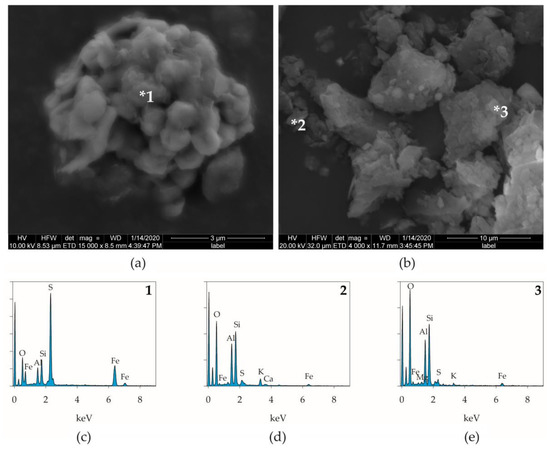 In the Rio de Janeiro site, in RJ-MM, SEM micrographs showed the presence of smooth spherical authigenic pyrite framboids (Figure 8a) along with irregularly shaped kaolinite particles (Figure 8b). The SEM-EDS analysis corroborated this mineralogical assemblage by elemental composition (Fe, S, Si, O, Al, and K; Figure 8c–e).