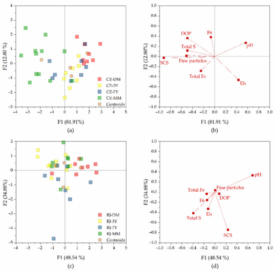 The discriminant analysis revealed contrasting effects of revegetation in the study sites (Figure 9). In Ceará, there was an increase in SCS, DOP, fine particles (silt and clay), and S and Fe contents in mature and replanted mangrove plots (Figure 9a,b). In fact, these variables explained 81.91% of data variance, while Eh values and pyritic Fe explained only 12.80%. Conversely, in Rio de Janeiro, no apparent effects of revegetation were observed (Figure 9c,d). Nevertheless, the pyritic Fe, SCS, and DOP vectors in data from RJ-7Y indicated a higher value of these parameters in this plot than in others.