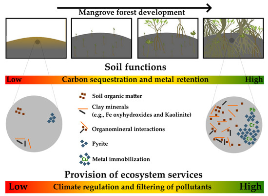 Mangroves are recognized as one of the most valuable ecosystems due to their wide range of ecosystem services, whose worth is estimated at USD 24 trillion per year [1]. Among the ecosystem services provided by mangroves, those associated with soil processes (e.g., carbon sequestration and pollutant immobilization) [2,3,4,5] are currently among the most addressed. Accordingly, mangrove preservation and restoration programs that guarantee the proper functioning of their soils are vital to ensure ecosystem services [6,7].