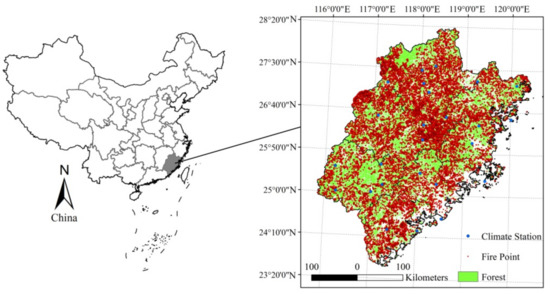 Forest fire data were obtained from the MODIS with a 1 km resolution of daily forest fire products, MOD14A1 [41]. The Terra and Aqua satellites were used, capable of 12 h flight cycles and enabling effective fire observations but unable to distinguish forest fires from other fire types, as well as forest fire hotspots recorded multiple times in a fire. Using this data, the Collection 6 algorithm can effectively distinguish cloud-covered areas, while forest fires cannot be assessed in thick cloud-covered areas. Therefore, in this study, we assumed that there were no fires in cloud-covered areas. This method has almost no effect on regional-scale forest fire dynamic analysis and was verified with high-precision ASTER satellite images. The overall forest fire error rate is about 1.2% [42]. In this study, the satellite hotspots in Fujian Province from 2001 to 2016 were selected to eliminate the hotspots of 1 km, using the map of land-use types of 1 km and less than 1 km within 24 h, and the earliest forest hotspots were selected as representative [43]. The forest fire season concept of reference [44], combined with China’s forest fire policy, further defined the forest fire season as the minimum continuous period containing more than 90% of the number of forest fires.