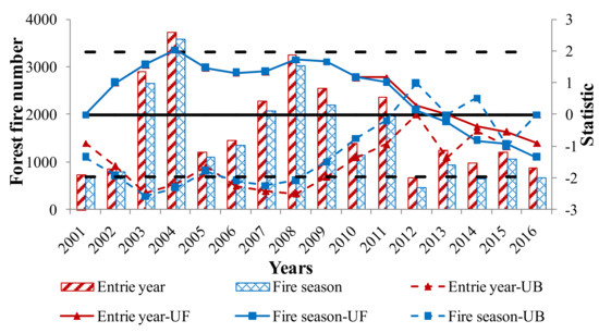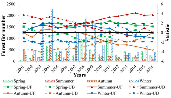 Seasonally, the numbers of forest fires were 6056, 2104, 5487, and 14,192 in the spring, summer, autumn, and winter, respectively, from 2001 to 2016, with a rising trend in the spring and summer, and a decreasing trend in the autumn and winter (Figure 3). According to the numbers and trends of forest fires, the main fire seasons could be divided into autumn and winter from 2001–2008 and spring and winter from 2009–2016 (Figure 3). Spring and summer fires mutated in 2002 and 2007, respectively, and increased significantly in 2004, 2008, 2009, and 2011 in the spring, maintaining significantly high levels in 2008–2016. Autumn forest fires had a downward trend in 2008 and mutated in 2011 with winter forest fires (Appendix A Figure A2), which had a significant downward trend (Figure 3).