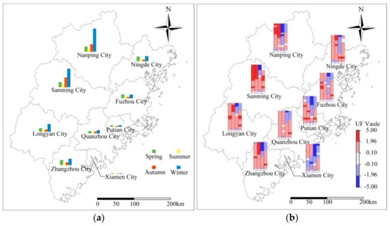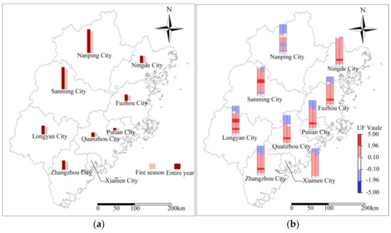 Forest fires in Longyan City, Sanming City, and Nanping City in western Fujian Province mainly occurred in the autumn and winter and were significantly more frequent than in the spring and summer, and maintained a growing trend after 2010 (Figure 5a). Forest fires in other eastern coastal cities mainly occurred in the spring and winter, rising in the spring and winter, with relatively few in summer and most significantly decreasing in autumn (Figure 5b).