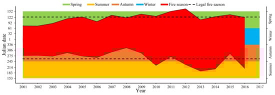 The 2001–2016 forest fire season in Fujian Province could be divided into two stages; the first stage was the 2001–2008 forest fire season, which fell within the legal fire season limit, and the overflow fire period was 2009–2016 (Figure 6). During the period from 2001 to 2008, the fire season was within the legal limits of fire season. The forest fire season started to extend in spring 2009 and autumn 2010, highly exceeding the spring fire season period boundary in 2012 and the autumn fire period boundary in 2013. The forest fire season in spring increased by about 3.5 days per year to about 40 to 50 days. There was no obvious trend in the summer season, which was about 30 to 40 days.