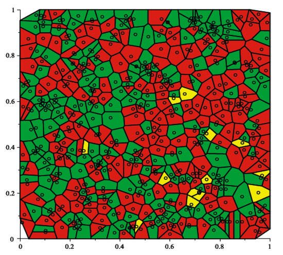 A stochastic differential equation model for height and diameter kinetics during a stand growth period was described in [19], regardless of the potentially available area dynamics. The potentially available area of an individual tree can be easily and reliably calculated using Voronoi diagrams [20]. To illustrate a Voronoi diagram, a polygon (potentially available area) of each individual pine, spruce, and birch tree in a randomly selected plot is shown in different colors in Figure 1.
