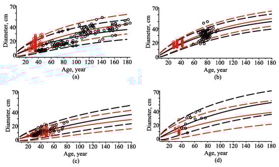 Kinetics of the mean, 0.05 quantile, and 0.95 quantile of the diameter for two randomly selected stands from a validation dataset: (a) all species; (b) pine (Pinus sylvestris); (c) spruce (Picea abies); (d) silver birch (Betula pendula Roth and Betula pubescens Ehrh.); solid line—mean trajectory; dashed line—quantile trajectories; black—first stand; red—second stand; and circle—observed data.