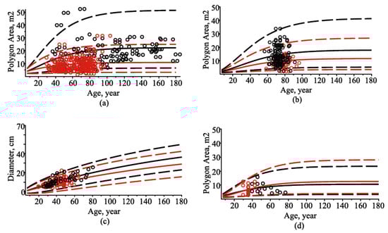 Figure A1, Figure A2 and Figure A3 show that marginal probability density functions change with stand age and show quite significant differences for different stands. These distributions allow us to define the trajectories of the mean and various moments for diameter, area, and height. According to the equations of the mean and quantile trajectories presented in Table A1, the kinetics of diameter, area, and height for the different tree species are shown in Figure 2, Figure 3 and Figure 4 along with the measurement dataset for the plot.