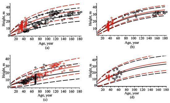 Kinetics of the mean, 0.05 quantile, and 0.95 quantile of the height for two randomly selected stands from a validation dataset: (a) all species; (b) pine (Pinus sylvestris); (c) spruce (Picea abies); (d) silver birch (Betula pendula Roth and Betula pubescens Ehrh.); solid line—mean trajectory; dashed line—quantiles trajectories; black—first stand; red—second stand; and circles—observed data.