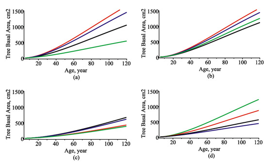 Kinetics of the mean tree basal area for four randomly selected stands from a validation dataset: (a) all species; (b) pine (Pinus sylvestris); (c) spruce (Picea abies); (d) silver birch (Betula pendula Roth and Betula pubescens Ehrh.); black—first stand; red—second stand; blue—third stand; and green—fourth stand.