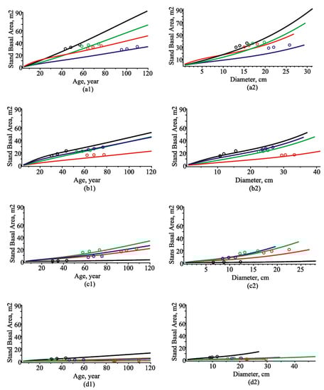 Kinetics of the stand basal area for four randomly selected stands from a validation dataset: (left panel) against the age; (right panel) against the diameter predictions; (a1,a2) all species; (b1,b2) pine (Pinus sylvestris), , respectively; (c1,c2) spruce (Picea abies) , respectively; (d1,d2) silver birch (Betula pendula Roth and Betula pubescens Ehrh.) , respectively; black—first stand; red—second stand; blue—third stand; green—fourth stand; and circles—observed dataset.