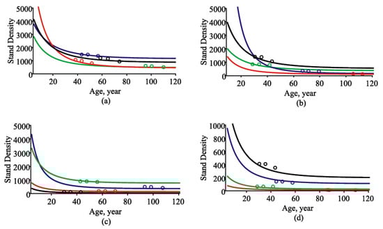 Kinetics of the stand density area for four randomly selected stands from a validation dataset: (a) all species; (b) pine (Pinus sylvestris), ), respectively; (c) spruce (Picea abies) , respectively; (d) silver birch (Betula pendula Roth and Betula pubescens Ehrh.) , respectively; black—first stand; red—second stand; blue—third stand; green—fourth stand; and circles—observed dataset.