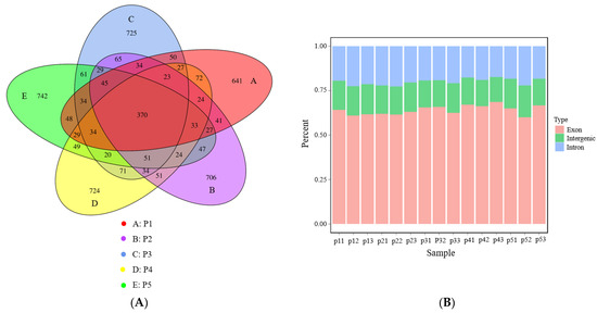 In order to identify the circRNAs involved in drought stress response in moso bamboo, we isolated RNA from untreated seedlings (P1) and seedlings treated with drought for 6 h (P2), 12 h (P3), 24 h (P4) and 48 h (P5), respectively, and constructed RNA-Seq libraries, which were subjected to sequencing using the Illumina Hiseq 2500 platform. A total of 282,140,000 clean reads were generated from 15 samples. After removing the adapter, low-quality sequences and primer sequences, raw reads were mapped to the moso bamboo reference genome; the GC content was approximately 45.5% and Q30 was greater than 94% (Table S1). A total of 4931 circRNAs were detected from samples using find_circ tools (Figure 1A). In addition, 370 circRNAs were found in samples from all five periods. According to the genomic locus, we divided the circRNAs of 15 samples into exon region, intron region and intergenic region. Most bamboo circRNAs are composed of exons (Figure 1B). The length of major bamboo circRNAs ranges from 200 bp to 800 bp (Figure 1C). We calculated the number of circRNAs on each chromosome (Figure 1D). The abundance and distribution of circRNAs on chromosome 13 and 15 are much higher than those on other chromosomes. Moreover, 4047 circRNAs are derived from 2874 host genes, of which 76.79% host genes produce only one circRNA. The rest of the host genes produce more than one circRNA, while the maximum amount of circRNAs that one host gene can produce is 14 (Figure 1E). The same host gene generates various circRNAs through alternative splicing. The relationships of these alternative circRNAs can be divided into three classes: no association, one contains the other, or one has a similar splice site and the other has a different splice site (Figure 1F).