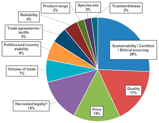 Demanded physical properties include strength, storage capability, long fibres, colour/aesthetic value, or durability, but demands and grades differ by countries and intended uses. Some very important desired attributes of forest products gather around availability and reliability (consistency) of the supply of the product as well as—of course—price. While price was a strong consideration in whether to trade in international forest products by fifteen per cent of the online survey respondents, it was not the most important factor. When prompted to provide factors in order of importance, quality, sustainability, and legality were commonly listed, whereas price was not ranked by any of the 37 respondents as the prominent factor (Figure 3). One reason for that might be that pricing mechanisms in forestry are strongly influenced by supply and demand and also views on relative qualities and substitution, e.g., between Douglas fir and radiata pine or between pruned and A-grade logs. In addition, the ability for forest growers to hold stock in the forest warehouse and continue to add value makes a point of differentiation compared to seasonal sectors such as agri-food and horticulture. Arguably, in an inflexible seasonal context, credence attributes might even offer greater value.