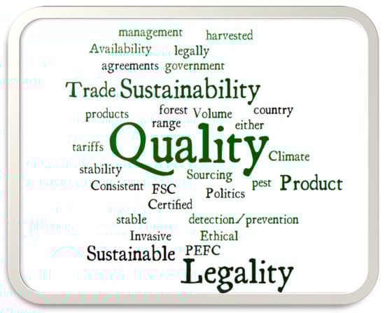 The data from the online survey was analysed using MS Excel, with weighted average rankings applied to four Likert terms, highlighting the mean scores and confidence levels, while qualitative survey results from open-ended questions were ranked based on frequencies of common terms, and run through the word cloud generator WordItOut (https://worditout.com/word-cloud/create; accessed on 12 May 2021), whereby the size of the word indicates the frequency of respondents’ use of the word in their description of highly ranked criteria for forest products trade. Questions of the Delphi interviews and from the online survey are attached as Supplementary Materials.