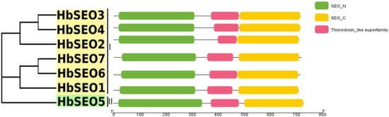 The distribution of conserve domains for each of HbSEO proteins is shown in Figure 1. From phylogenetic analysis, the seven identified HbSEO proteins were divided into two groups, among which HbSEO3, HbSEO4, HbSEO2, HbSEO7, HbSEO6, and HbSEO1 were classed into group I, and HbSEO5 was classed into group II.