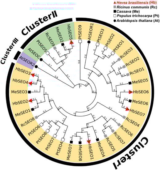Phylogenetic analysis of SEOs from H. brasiliensis, A. thaiana, M. esculenta, R. communis, and P. trichcarpa. All complete protein sequences were aligned using MEGA-X software, and the phylogenetic tree was displayed using EvolView. The phylogenetic tree was constructed using the maximum likelihood method and JTT matrix-based model, with bootstrap replications of 1000. The numbers on branches indicate the evolutionary distance.