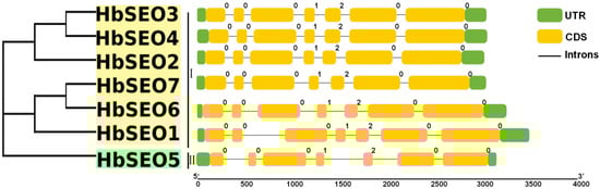 Gene structure analysis showed that the HbSEOs were rather conservative (Figure 3). They all contained six introns and seven coding sequences. Compared to other genes, HbSEO5 contained longer introns for the first and forth introns. More importantly, at the 3′ end of HbSEO5, the UTR length was much shorter than other genes. Therefore, gene length and CDS distribution were closely related with their phylogenetic relationship, making genes with similar gene structures group together.