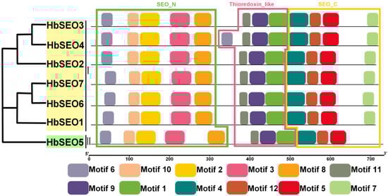 Using MEME online tool, a total of eleven or twelve conserved motifs were identified in the HbSEO amino acid sequences (Figure 4). Most HbSEO proteins contained 12 conserved motifs, with the arrangement order being, motif 6-motif 10-motif 2-motif 3-motif 8-motif 11-motif 9-motif 1-motif 4-motif 12-motif 5-motif 7. These motifs corresponded to the three HbSEO conserved domains, with motif 6, motif 10, motif 2, motif 3, and motif 8 harbored in SEO_N; motif 11, motif 9, and motif 1 harbored in the Thioredoxin_like super-family; and motif 4, motif 12, motif 5, and motif 7 harbored in SEO_C. Nevertheless, HbSEO4 contained an extra motif 6 at a length of 300–400 and HbSEO5 lacked motif 7 at the 3′ end of the protein. The distributions of these motifs further supported the phylogenetic classification of HbSEOs.