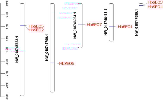Chromosome localization analysis (Figure 5) showed that the HbSEOs were unevenly distributed across the five chromosomes of H. brasiliensis. HbSEO2 and HbSEO5 were located on NW_018745783.1, HbSEO3 and HbSEO4 were located on NW_018747589.1, and the other three genes, HbSEO6, HbSEO7 and HbSEO1, were individually distributed on three chromosomes.