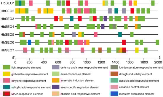 Cis-acting element analyses of HbSEOs. Different color boxes represent different cis-elements. The 2000 bp upstream of HbSEO gene promoter sequences were selected to detect promoter cis-elements using the PLANTCARE database.