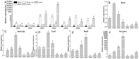 Real-time fluorescence quantitative PCR (qRT-PCR) analysis of the expression of HbSEOs was conducted in the roots, stem tips, leaves, bark (young), and latex of rubber trees (Figure 7). Figure 7A shows that the expression levels of all HbSEO genes were comparatively low in leaves; HbSEO1, −2, and −6 had the highest expression level in young stem, and HbSEO3, −4, −5, and −7 were highly expressed in latex. When compared the various HbSEOs in the same tissues (Figure 7B–F), it was shown that in root, the transcript levels of HbSEO2 and HbSEO3 were the highest, and HbSEO5 was lowest (Figure 7B); and in stem the expression of HbSEO3 and HbSEO4 was the highest, and HbSEO5 was lowest (Figure 7C); while in leaf, HbSEO3 and HbSEO4 showed the highest, and HbSEO6 showed the lowest, expression level (Figure 7D); however, in bark and latex, HbSEO4 and HbSEO3 showed the highest expression, and HbSEO5 showed the lowest expression level (Figure 7E,F). The high expression of HbSEO3 and HbSEO4 in stem, leaf, bark, and latex suggested these genes might be related to latex production.