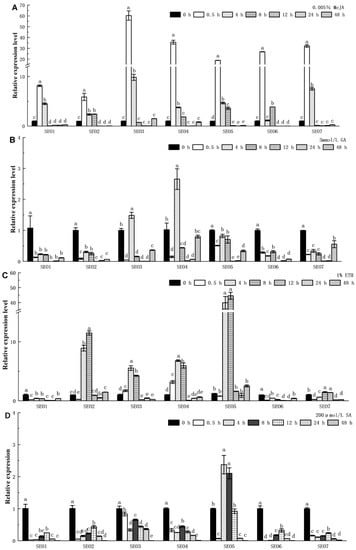 Relative expression profiles of HbSEOs under different hormone treatments. (A) 0.005% MeJA, (B) 3 mmol/L GA, (C) 1% ETH, and (D) 200 μmol/L SA. The rubber tree 18S gene was used as the internal control. To calculate the relative expression level of each gene in different treatment times, their expression level at 0 h was used to normalize the expression levels at other times. The relative expression of the target gene was calculated using the 2−ΔΔCT method. Different small-case letters represent statistical difference following Duncan’s one-way ANOVA (p < 0.05) for same genes.