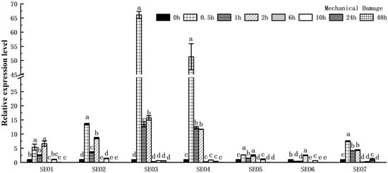 Relative expression variation of HbSEOs subjected to mechanical injury treatments. To calculate the relative expression level of each gene at different treatment times, the expression level of each gene in 0 h was used to normalize the expression levels at other times. Different small-case letters signify statistical differences between means following Duncan’s one-way ANOVA (p < 0.05) for same genes for same genes.