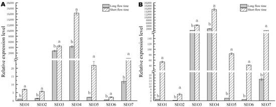 The relative expression of HbSEOs in the barks and latices of rubber trees with different flow durations. (A) in barks, (B) in latices. Data normalization was performed with the expression level of HbSEO1 in the long duration; ANOVA was performed for the same gene with different flow times. Different small-case letters signify statistical differences between means following Duncan’s one-way ANOVA (p < 0.05) for same genes.