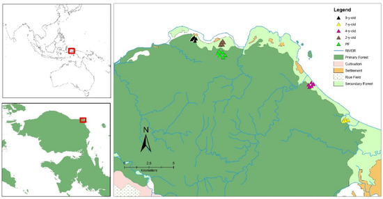 Location of the research in lowland evergreen primary forest (PF) and two- to nine-years-old post-swidden fallow forests in coastal areas of north Manokwari, West Papua, Indonesia.