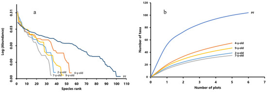 (a) The rank abundance curve or Whittaker plot implemented by plotting the log-transformed species abundance against species rank for all vegetation lifeforms. (b) Species accumulation curve for all vegetation lifeforms using sample rarefaction (Mao’s tau) in fallow forests between two- and nine-years-old and primary forest (PF) in coastal areas of north Manokwari, West Papua, Indonesia.
