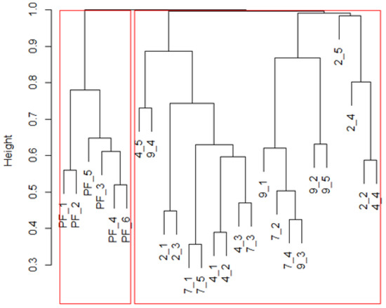Grouping of plots in the primary forest (PF) and fallow forests between two- and nine-years-old in coastal areas of north Manokwari, West Papua, Indonesia. All vegetation lifeforms are grouped together and plant density in smaller plots is multiplied accordingly to give the equivalent area sampled for each lifeform. The number before the dash is the age of the fallow (2 for two-year-old, 4 for four-year-old, 7 for seven-year-old, and 9 for nine-year-old) while the number after the dash is a label for each plot.
