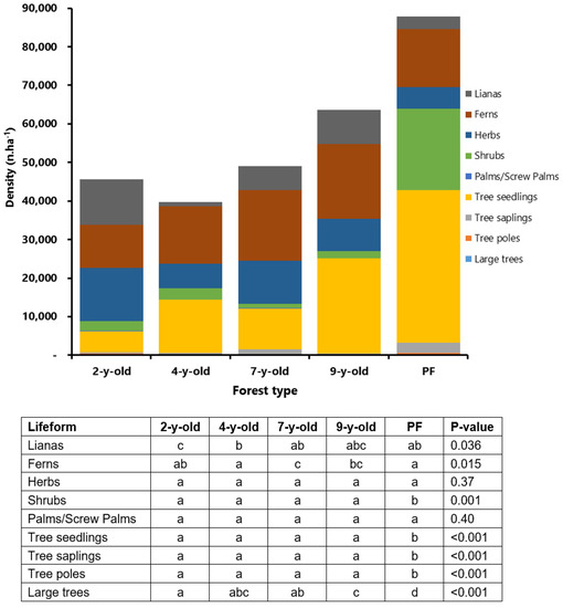 The mean density of vegetation lifeforms in fallow forests between two- and nine-years-old and primary forest (PF) in coastal areas of north Manokwari, West Papua, Indonesia. Plant density in smaller plots is multiplied accordingly to give the equivalent area sampled for each lifeform. For clarity, error bars are omitted. Different lowercase letters in the table show the differences according to ANOVAs and Tukey’s tests with p < 0.05.