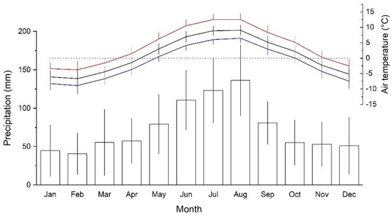 Mean monthly minimum (blue line), maximum (red line) and mean (black line) daily air temperature and mean monthly precipitation sums (bars) during the study period 1991 to 2020 at the meteorological station on top of Mt. Patscherkofel (2246 m asl). Standard deviations are indicated.