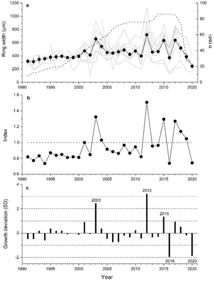 Extreme growth years in the standardized ring width chronology of A. alnobetula were determined according to [50] by calculating the difference between the current year’s growth and the average growth of the last five years and subsequent division by the standard deviation for the period 1991–2020. Years showing growth deviation >±1 SD were related to climate factors that were found to significantly limit RG.
