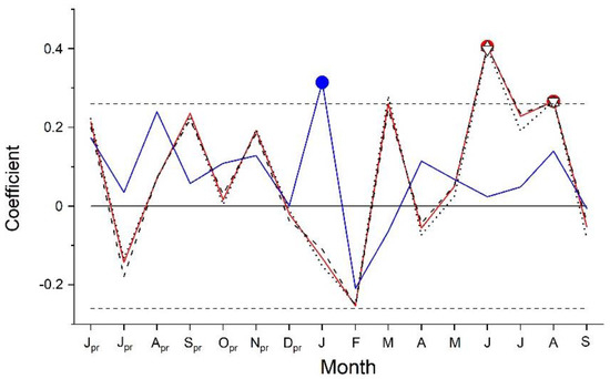 Response function analysis between standardized composite chronology of Alnus alnobetula and monthly precipitation sum (blue line and circle) and monthly mean, maximum and minimum air temperature (red line and filled circle, dashed black line and upward triangle, dotted line and downward triangle, respectively). Horizontal dashed lines represent 95% confidence intervals. Symbols indicate significant relationships at p < 0.05 (pr = previous year climate variable).