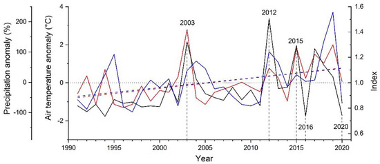 Comparison of standardized radial stem growth (black line) of Alnus alnobetula with anomalies in summer mean monthly air temperature (June–August; red line) and January precipitation (blue line) from long-term mean 1991 to 2020. Long-term means of air temperature during summer and January precipitation amounted to 8.3 °C and 45 mm, respectively. Trend lines (linear regressions) for summer temperature (R2 = 0.212) and January precipitation (R2 = 0.138) are indicated by dashed lines. Extreme growth years are labelled and marked with vertical dashed lines.