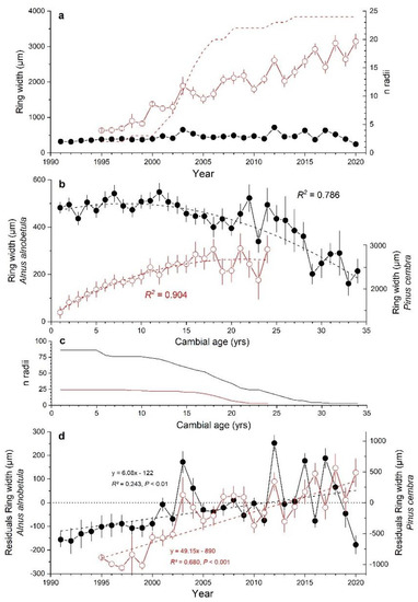 Inherent age/size trends in ring width measurements of both species were determined by averaging cambial-age-aligned ring width series (e.g., [45]). Trends in these ring width series, expressed as a cubic function, were used to detrend raw measurements for “biological-noise” (i.e., age/size trend) by calculating residuals (i.e., ring width series minus trend function). This procedure makes it possible to capture the long-term growth response to climate warming. Correct dating of measured ring width time series was statistically checked with COFECHA [46]. The partially low agreement in ring width variations among radii within and between A. alnobetula stems, which was caused by frequent occurrence of asymmetric growth, anomalous growth patterns and high portions of discontinuous rings (Supplementary Material, Figure S1), made it necessary to exclude about a quarter of the measured radii when creating the composite A. alnobetula chronology. Finally, the developed composite ring width chronologies comprised 86 radii taken from 51 stems of A. alnobetula and 24 radii from 16 stems of P. cembra. We refrained from analysing site-specific time series of radial stem growth because low sample depth and different series length would have made a comparative analysis impossible.